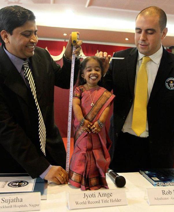 乔蒂·阿姆奇(Jyoti Amge)是一位来自印度的传奇女性,她以“世界上最矮的女人”这一身份闻名于世,凭借着乐观积极的态度和对梦想的执着追求,书写了属于自己的精彩人生。以下是对她生平的详细介绍: 乔蒂·阿姆奇(Jyoti Amge),女,1994年生于印度纳格普尔,演员,世界最矮女性纪录保持者 。 乔蒂·阿姆奇因患有软骨发育不全症,是世界上最袖珍的女孩子,身高约为 62.8 厘米,体重约为6公斤。2009年,乔蒂·阿姆奇与彭戈拉舞明星米卡·辛格(Mika Singh)共同录制歌曲MV,同年乔蒂首次亮相日本富士电视台的《令人惊奇的100位奇人异士(Bikkuri Chojin 100 Special)》节目第二期,并参演英国第4频道纪录片《身体奇迹(Bodyshock)》中的一集——“两英尺高少年(Two Foot Tall Teen)” 。2011年12月16日,乔蒂获得了“在世最矮的女性(可行动)”吉尼斯世界纪录认证。2012年1月31日,乔蒂·阿姆奇代表右翼党参加印度孟买市政选举 ,同年与“世界上最矮的男人”钱德拉·巴哈杜尔·唐吉(Chandra Bahadur Dangi)合影,担任印度真人秀节目《老大哥(Big Brother)》的嘉宾。2014年,乔蒂在美国热门电视剧《美国恐怖故事(American Horror Story)》第四季出演玛·皮塔特(Ma Petite)一角 。2024年,乔蒂·阿姆奇在伦敦首次与“世界上最高女性”鲁梅萨·盖尔吉(Rumeysa Gelgi)见面。 童年与疾病困扰 1993年12月16日,乔蒂出生在印度中部城市那格浦尔。据她的母亲兰加纳回忆,乔蒂在五岁前身高发育正常,是个中等身材的孩子。然而,五岁之后,她的生长发育逐渐停滞,后来被诊断为患有“软骨发育不全”的侏儒症,这导致她的身高无法像正常人一样增长。 尽管身材矮小,但乔蒂并未放弃学习的机会。从四岁起,她便与正常身高的孩子们一起上学读书,学校还专门为她定制了一套适合其矮小身材的桌椅,方便她学习生活。 初获关注与世界纪录 2009年,15岁的乔蒂迎来了人生的重要转折点。她参加了日本富士电视台的《令人惊奇的100位奇人异士(Bikkuri Chojin 100 Special)》节目,在节目现场,医生测量她的身高仅为61.95厘米,体重只有5.4千克,她也因此被确认为“在世身高最矮的青少年(女性)”,开始受到全世界的广泛关注。 2011年12月16日,乔蒂年满18岁。在那格浦尔市的沃克哈特超级专科医院,整形外科顾问医师为她测量身高,经反复测量,她的身高为62.8厘米,吉尼斯世界纪录认证官亲临现场监督了测量过程。凭借这一身高,她获得了“在世身高最矮的女性(可行动)”吉尼斯世界纪录认证。 演艺梦想与职业发展 乔蒂从小就怀揣着成为演员的梦想,而她独特的身高和逐渐积累的名气,为她的演艺之路奠定了基础。2009年,她就在彭戈拉舞明星米卡·辛格的歌曲MV中出镜,同年还参演了英国第4频道纪录片《身体奇迹》中的“两英尺高少年”一集节目。 2012年,乔蒂参加了印度真人秀节目《老大哥》,进一步提升了自己的知名度。2014年,她迎来了演艺生涯的重大机遇,签约出演美国热门电视剧《美国恐怖故事》第四季,在剧中饰演玛·皮塔特一角。她用出色的表演证明了身材矮小的人同样能在演艺界大放异彩,也凭借此角色获得了“世界上最矮的女演员”这一吉尼斯世界纪录称号。 除了电视剧和纪录片,乔蒂还多次亮相于意大利、土耳其等国家的吉尼斯世界纪录相关电视节目,成为了全球知名的公众人物。 生活态度与社会影响 生活中的乔蒂性格活泼开朗,和普通的少女一样,她喜欢漂亮衣服,热爱化妆打扮,享受生活中的美好事物。尽管因为身高原因,她的衣服、首饰、餐盘餐具等都需要特别定制,甚至睡觉的床都是迷你型的,但她始终保持着积极乐观的态度。 乔蒂在社交媒体上拥有众多粉丝,她通过网络向世界展示自己的生活,传递坚强、独立、自信的生活态度,激励着无数人。她曾表示,虽然自己身材矮小,但不会让身材限制对幸福和梦想的追求。不过,她也面临着一些困扰,比如人们常常会把她当作孩子对待,像问婴儿一样问她问题,或者像抱婴儿一样抱她,这让她感到有些尴尬。 旅行经历与交流活动 成名之后,乔蒂有了更多机会前往世界各地旅行。她曾表达过想去伦敦和美国旅行的愿望,并且这些愿望都已逐一实现。她还与许多其他世界纪录保持者有过交流互动。2012年,她与“世界上最矮的男人”钱德拉·巴哈杜尔·唐吉合影,两人的相遇成为了吉尼斯世界纪录历史上的一个经典时刻。2024年,她先后与“世界上最高的男人”苏尔坦·科森以及“世界上最高的女性”鲁梅萨·盖尔吉见面并合影,这些经历让她感受到了不同身高的人之间的共鸣,也让她更加坚定了勇敢做自己的信念。 乔蒂·阿姆奇以自己独特的人生经历,向世人证明了身高并不能定义一个人的价值和能力。她用乐观、勇敢和坚持,打破了身体的局限,在世界舞台上绽放出了属于自己的光芒,成为了激励无数人的榜样。 |